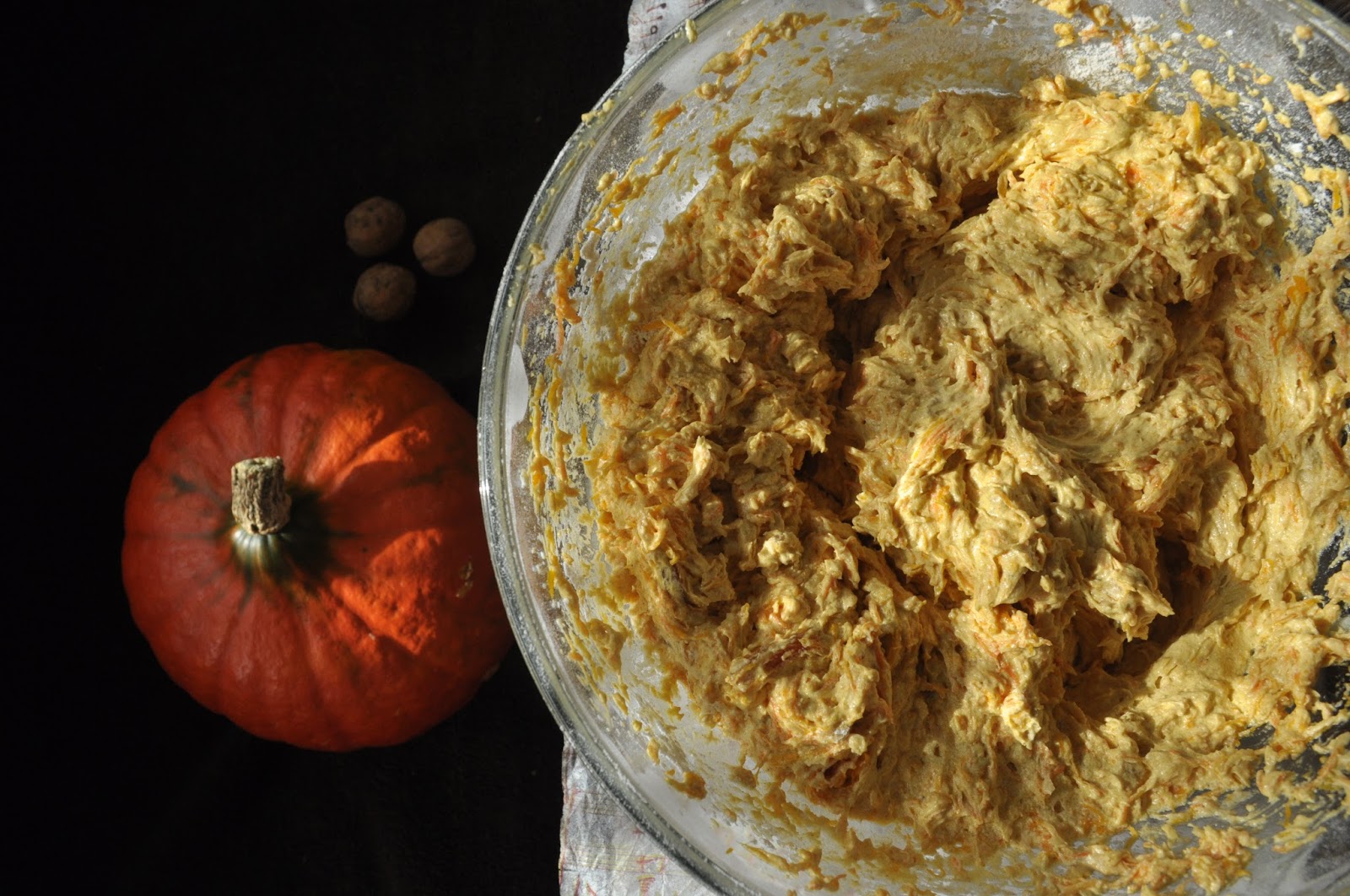 Składniki: 4 jajka, 1 szklanka surowego cukru trzcinowego, 1 masło (200g),2 szklanki mąki orkiszowej, 1 nieubita szklanka drobno startej marchwi, 1 nieubita szklanka drobno startej dyni, pół szklanki orzechów włoskich (zamiennie można dodać migdały, pokrojoną w paski suszoną morelę), zmielone przyprawy korzenne: cynamon, galgant, goździki, gałka muszkatołowa, opcjonalnie 1 płaską łyżkę proszku do pieczenia (warto zaopatrzyć się w proszek do pieczenia z kamieniem winnym) i 1 łyżeczkę sody.