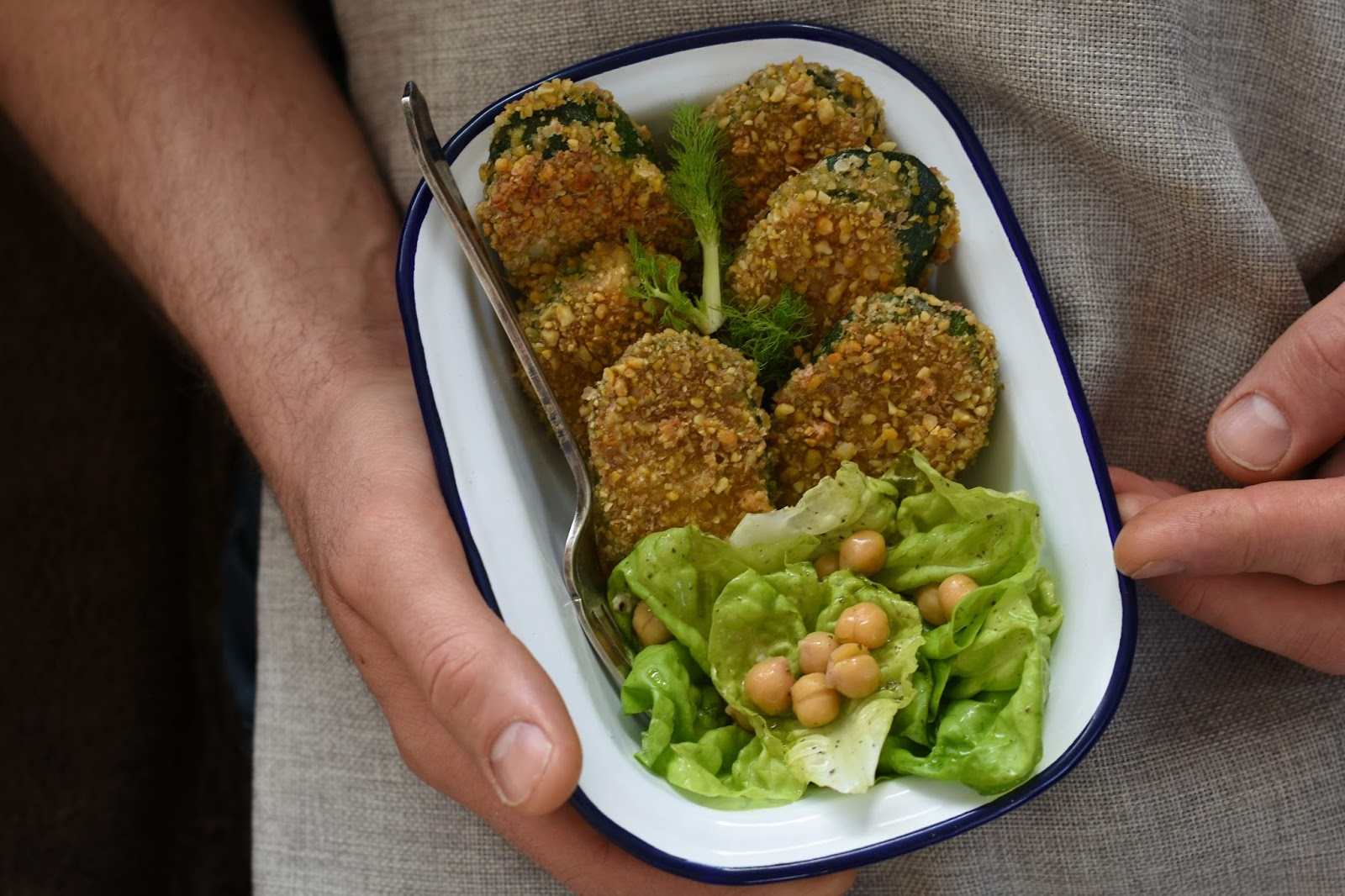 Składniki: 250g cukinii, 1 jajko (najlepiej od kur z tradycyjnego chowu), 2-3 łyżki mąki z kasztanów, 8 łyżek „bułki tartej” z ciecierzycy (wystarczy zmielić w młynku do kawy lub termomiksie suche ziarna), 2 ząbki czosnku (jeden do dressingu, drugi do panierki), olej słonecznikowy do smażenia, plus sałata z dressingiem (olej, ocet winny/sok z cytryny, czosnek, sól, pieprz i zioła do smaku) i kilkoma łyżkami ugotowanymi ziaren ciecierzycy, sól kamienna bez antyzbrylaczy, pieprz kubeba, bertram, galgant.